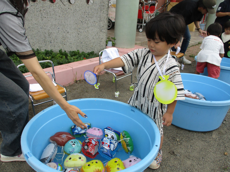それから職員からの出し物の『エビカニクス』を子どもたちと一緒に踊りました。次に、年長さんが作った『けろっぴおみこし』をワッショイの掛け声で素敵に披露してくれました。それからはお楽しみの縁日コーナー♪今年は、的当てか射的、ボーリング、くじびき、ヨーヨー、はんかち釣りの5種類でした。景品を袋いっぱいにもらい、とても嬉しそうな笑顔を見せていた子どもたち。