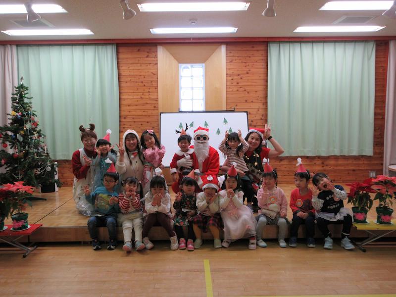 12月18日にクリスマス会が行われました。まず初めに園長先生からクリスマスについてのお話を聞きました。お楽しみは先生たちからのパネルシアターとハンドベルの演奏をプレゼント♪それからみんなで『あわてんぼうのサンタクロース』をうたっていると…鈴の音が聞こえてサンタさんが登場!特別にサンタさんはどこから来たのか、プレゼントは持って来たのかという質問に答えてくれました。