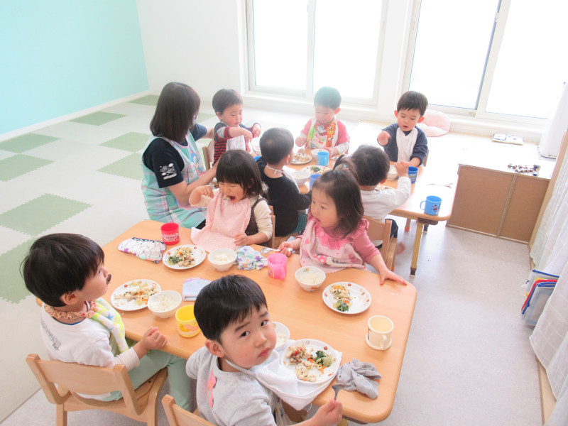 給食の時間になるとちゃんと(?)座ってモリモリ食べていますよ。汁物がだいすきで毎日おかわりしています。