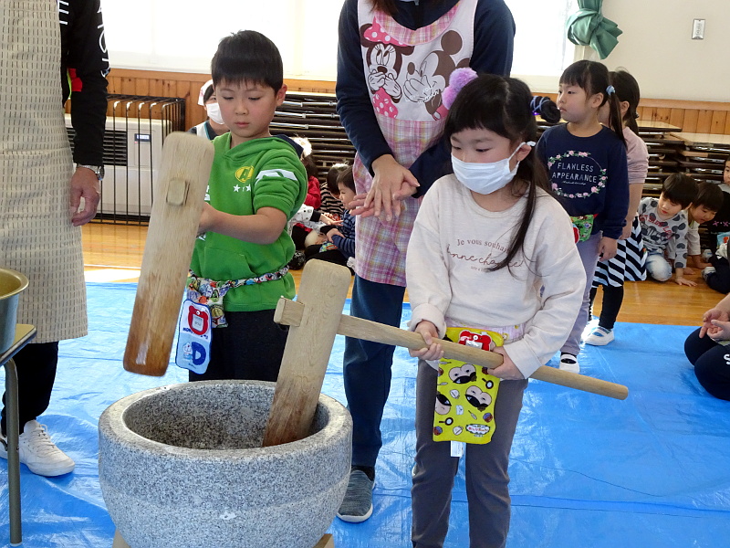 最初にバスの乗務員さんが餅つきのお手本を見せてくれ、いよいよ年少さんからお餅つきに挑戦です。しっかりねらいを定めて杵を振り下ろしているようでも、なかなかうまくいかず悪戦苦闘している子もいました。
