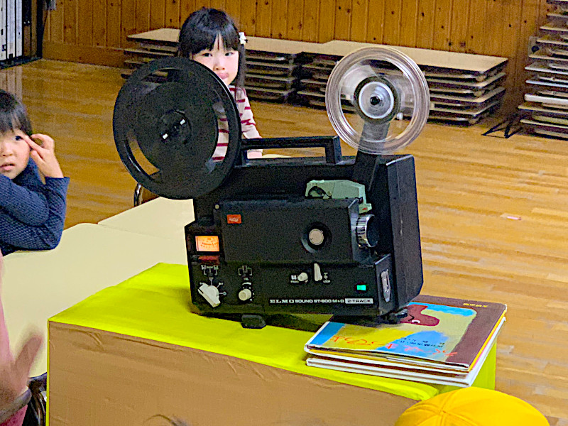 何本かあるフィルムの中から上映したのは『白雪姫』。映写機独特の機械音と8ミリフィルムのちょっとコモッタ感じの音声が懐かしい雰囲気でした。映画を見ていた子ども達からは時折笑い声も聞かれ上映後には「面白かった」「また見たい」という声もありました。15分程の短いフィルムのため、子ども達も飽きる事なくお昼寝前のひと時を楽しんでくれたようです。次はいつ観れるかな???