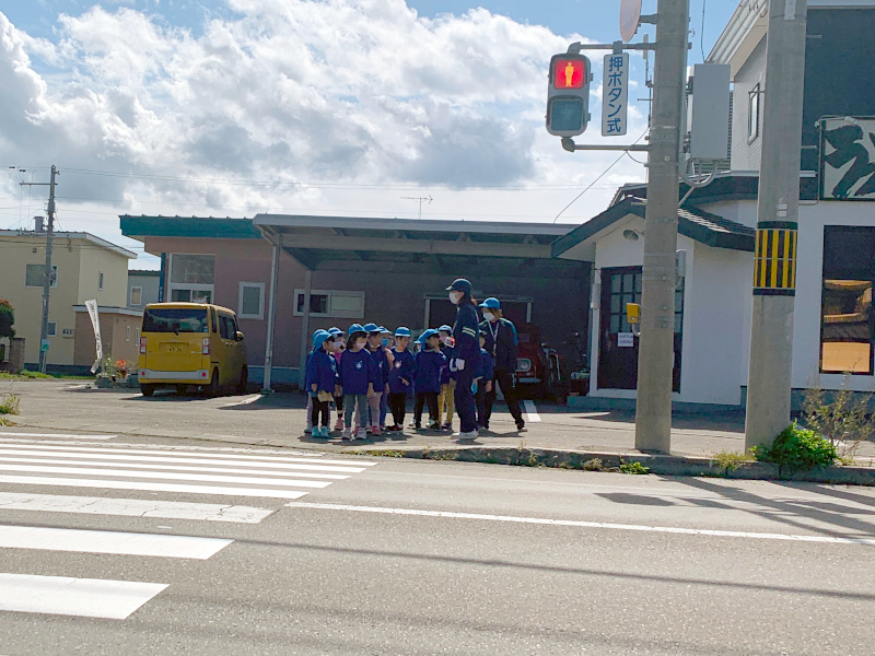 年長さんは小学校の入学に向け、歩道の歩き方や横断歩道・信号機の渡り方を教わりました。