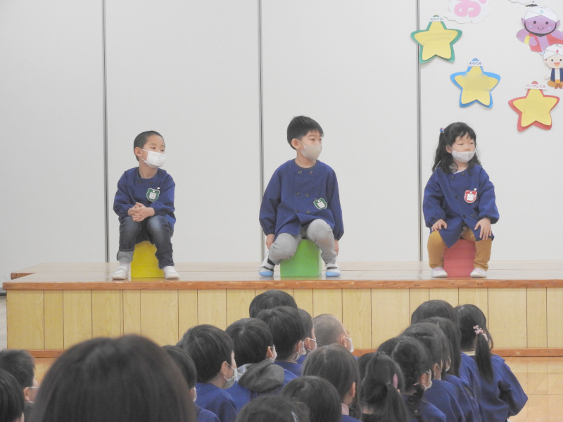 今月のお楽しみは第1部がひよこ組さん、第2部が先生方でした。ひよこ組さんは、全員で“ちょっとだけ体操”を楽しく、可愛く披露してくれました。
