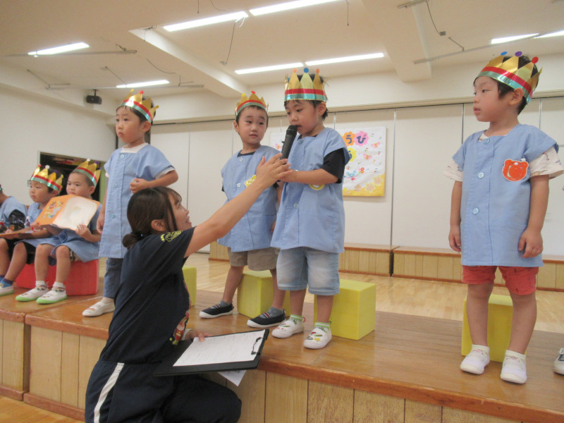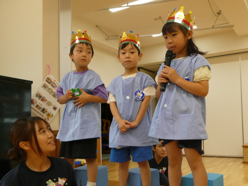 8月26日に8月生まれの誕生会を行いました。誕生会は,幼稚園行事の特別な日です。8月は,夜空にぱっと開く花火のように華やかな月。日本中でお祭りが行われます。お盆 には普段会えない人が集まったりする,とても賑やかな月でもあります。