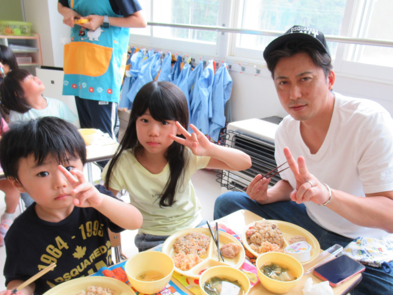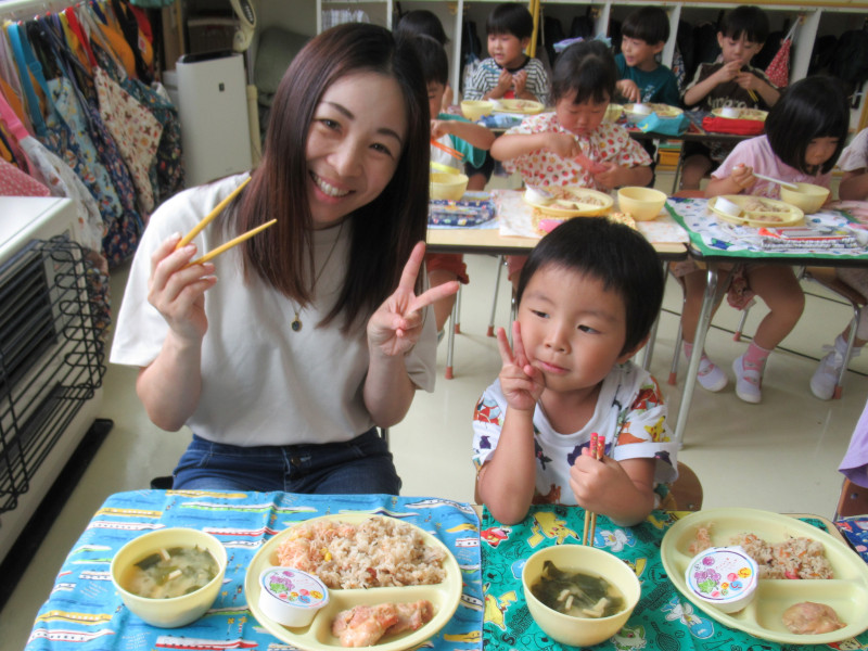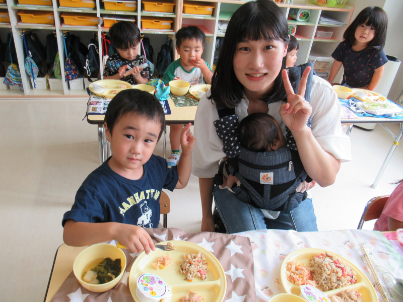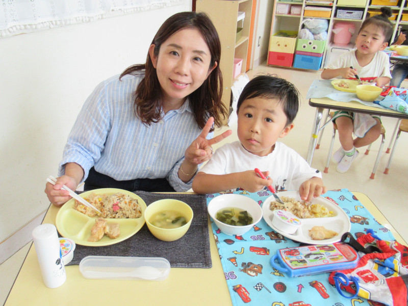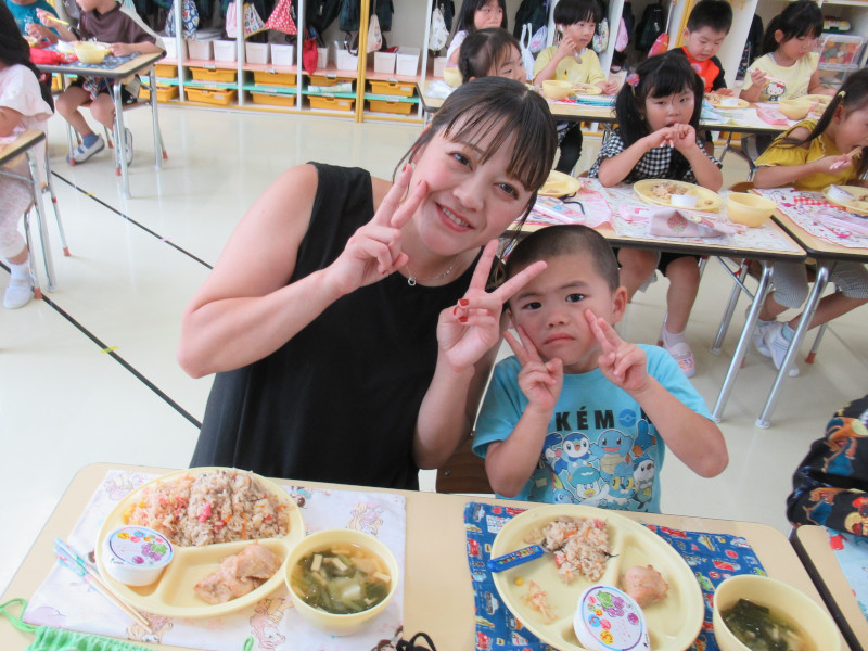 誕生会後は,8月生まれさんの給食試食会を行いました。「五目ご飯」「高野豆腐の味噌汁」「鶏の香味焼き」「キャベツのかにかま和え」「ぶどうゼリー」の栄養たっぷり,バランスばっちりな美味しい給食を親子で楽しみながら,和やかに誕生会&試食会は終了しました。