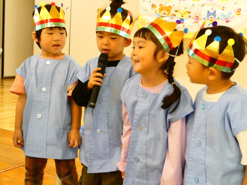 はじめに,誕生日を迎えたお友達は,ステージの上で,『組・名前・○歳になりました!』と発表し,将来の夢(年長)や好きな遊び(年中),好きな食べ物(年少)をお話ししてみんなからたくさん拍手をもらいました。