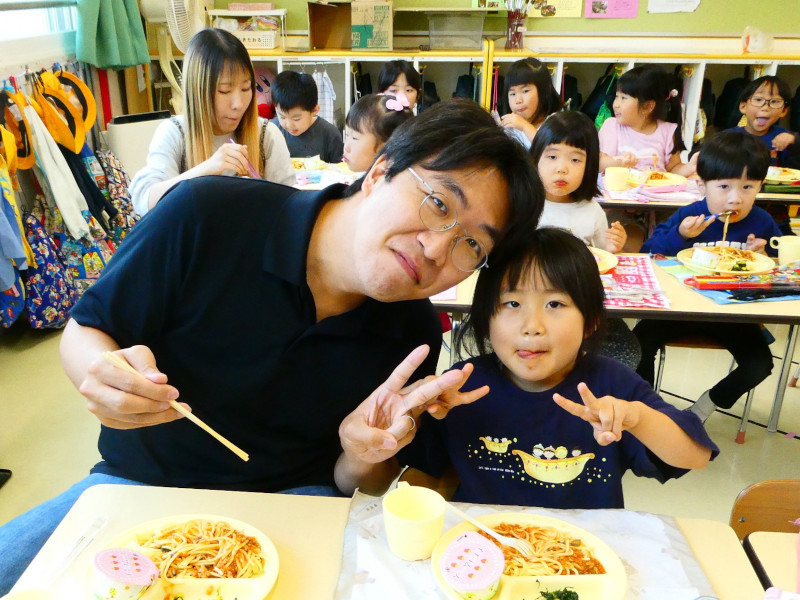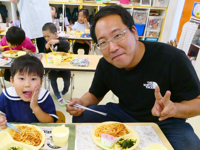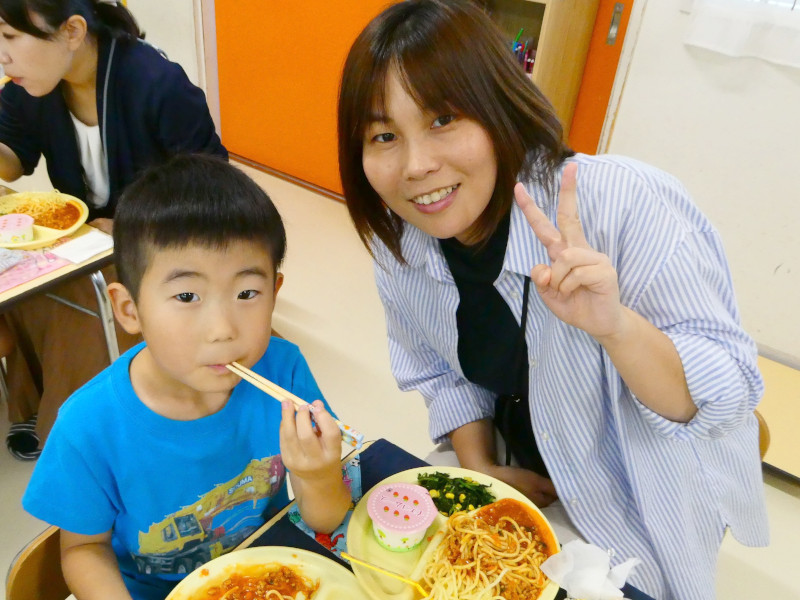 誕生会後は,9月生まれさんの給食試食会を行いました。「牛乳」「なすミートスパゲティ」「ほうれん草コーン炒め」「いちごムース」の栄養たっぷり,バランスばっちりな美味しい給食を親子で楽しみながら,和やかに誕生会&試食会は終了しました。