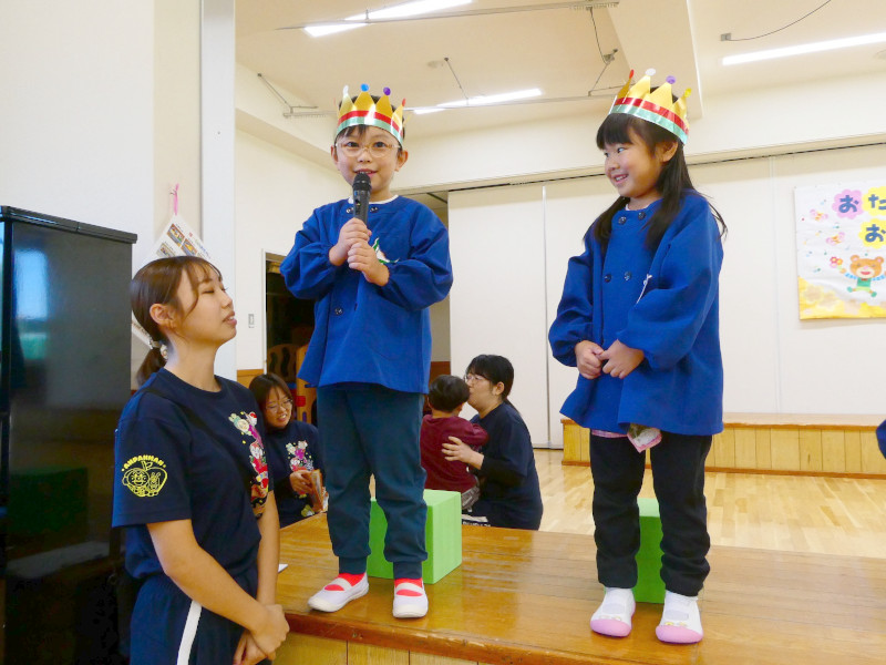 はじめに,誕生日を迎えたお友達は,ステージの上で,『組・名前・○歳になりました!』と発表し,将来の夢(年長)や好きな遊び(年中),好きな食べ物(年少)をお話ししてみんなからたくさん拍手をもらいました。