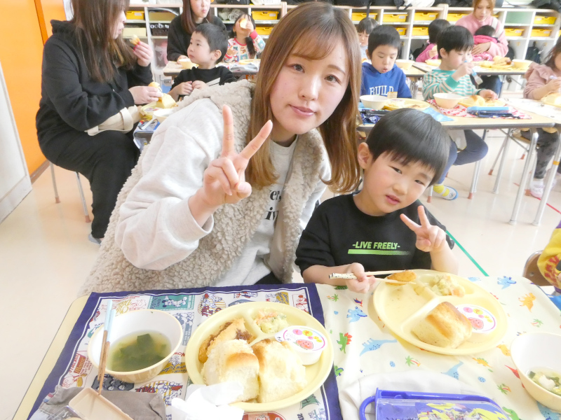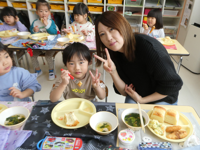 1月29日に1月生まれの誕生会を行いました。誕生会は、幼稚園行事の特別な日です。1月は、1年のはじまりの月。足跡のない新雪のようなまっさらの月。今年はこんなことしたいなとか、こんなことがんばろうとか、夢や希望が広がる月です。こんなはじまりの月に生まれた1月生まれのお友達は、ご家族の皆さんにとって、1番の希望になったことでしょう。1月生まれさんを園のみんなでお祝いしました。はじめに、誕生日を迎えたお友達は、ステージの上で、『組・名前・○歳になりました!』と発表し、将来の夢(年長)や好きな遊び(年中)、好きな食べ物(年少)をお話ししてみんなからたくさん拍手をもらいました。それから、みんなでHappy Birthdayの歌でお祝いし,もり組からの出し物,Snow Manの「カリスマックス」の,かっこいいダンスに釘付けになりました。園からはバースデイカードをプレゼントしました。 誕生会後は、1月生まれさんの給食試食会を行いました。「ベビーパン」「ほうれんそうのスープ」「ささみチーズフライ」「さつまいもサラダ」「ももゼリー」の栄養たっぷり、バランスばっちりな美味しい給食を親子で楽しみながら、和やかに誕生会&試食会は終了しました。参加いただいた保護者の皆様、ありがとうございました!