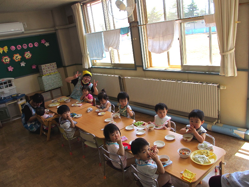 給食時には、初めはいらない!!たべない!!と泣いていた子も、今では泣くこともなく給食をもぐもぐ・・・・・おかわり。食べる事に一生懸命すぎて「あれ!?ももぐみってこんなに静かなの!?」とお言葉を頂くほどにもりもりとご飯を食べていますよ。