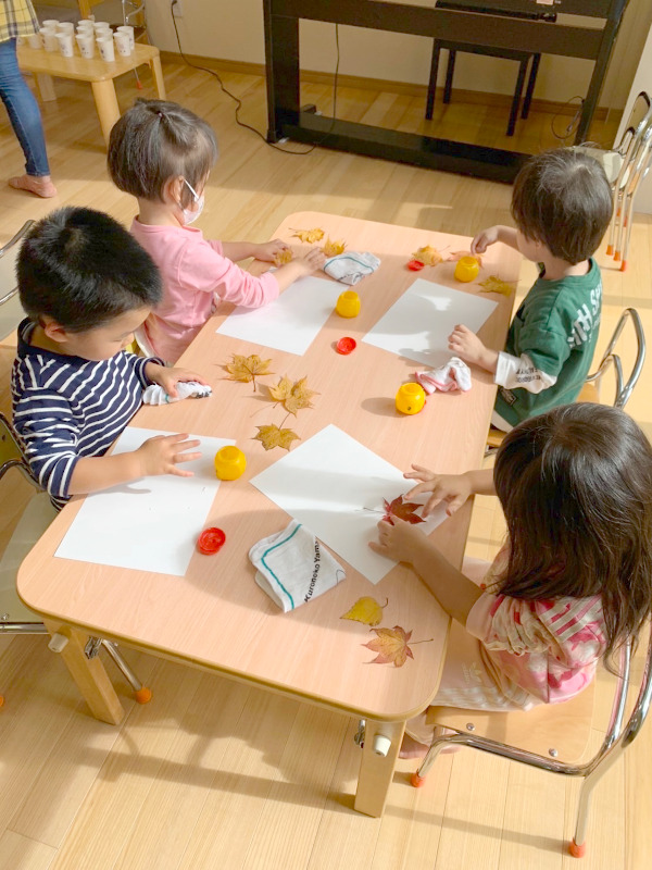 本格的な秋の訪れに、外遊びを楽しんでいる子ども達。お散歩に出かけると色付く木の葉や地面に重なる落ち葉を見て「黄色の葉っぱがたくさんあるね!」と秋を感じながらお話をしている姿が見られますよ(^^)