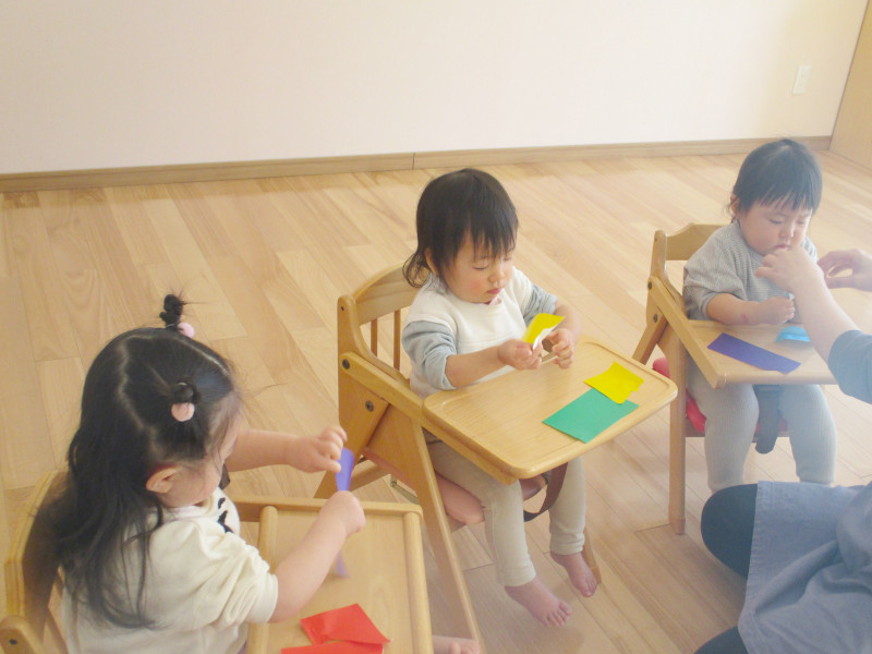 初めてのでんぷんのりに興味津々のひよこ組♪お手本で担任が指にのりを少しつけて紙に塗ると子ども達も真似をして一本指を出して上手に塗っていき、最初にちぎっていた折り紙をペタペタと貼りとっても楽しんでのりを使う事ができました。