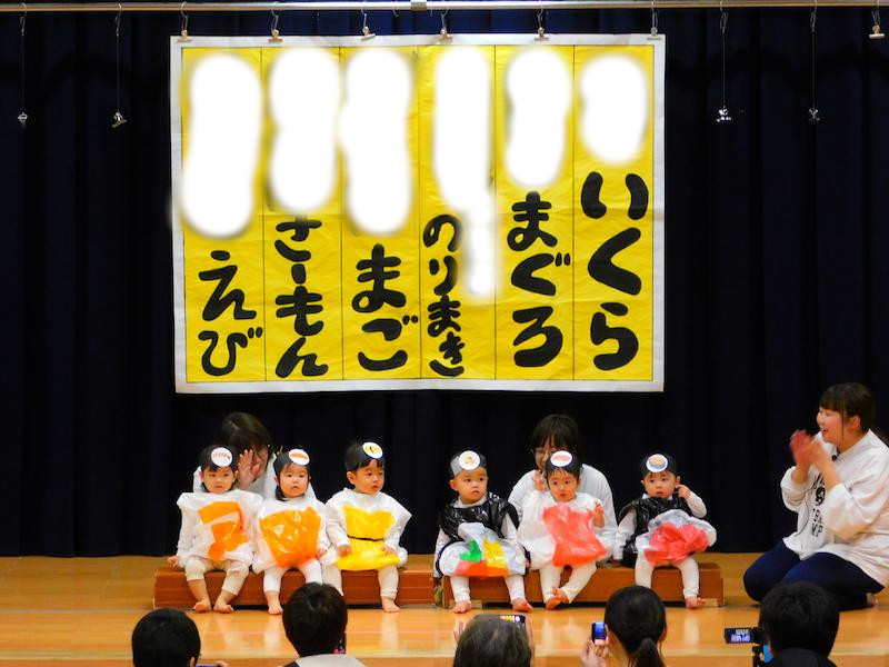 こんにちは!ひよこ組です!先日、発表会がありました!初めての発表会、大好きなお父さんお母さんの前でドキドキ。固まってしまったり、泣いていたけれど、お返事の「は〜い!」が出来たり、「おすしのピクニック」を踊ってみたりととっても頑張った子ども達です。発表会が終わってからもお部屋でおすしのピクニックの踊りを踊っている子ども達。お忙しい中、ありがとうございました!