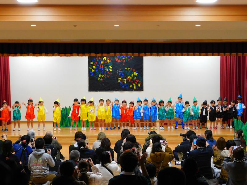 こんにちは!きりん組です!12月5日に発表会が行われました。「きんのがちょう」を題材に、縄跳びや鉄棒、ダンスに折り紙などを盛り込んだ劇に挑戦!練習を重ねていくうちに、一人一人が自信を持って出来るようになりました。当日は緊張をしながらも、クラスみんなで力を合わせて一生懸命発表する姿はとても素敵で、みんなキラキラ輝いていましたよ!発表会を通じて、更に成長した子ども達です!