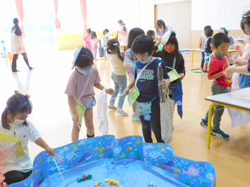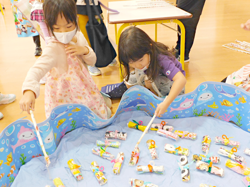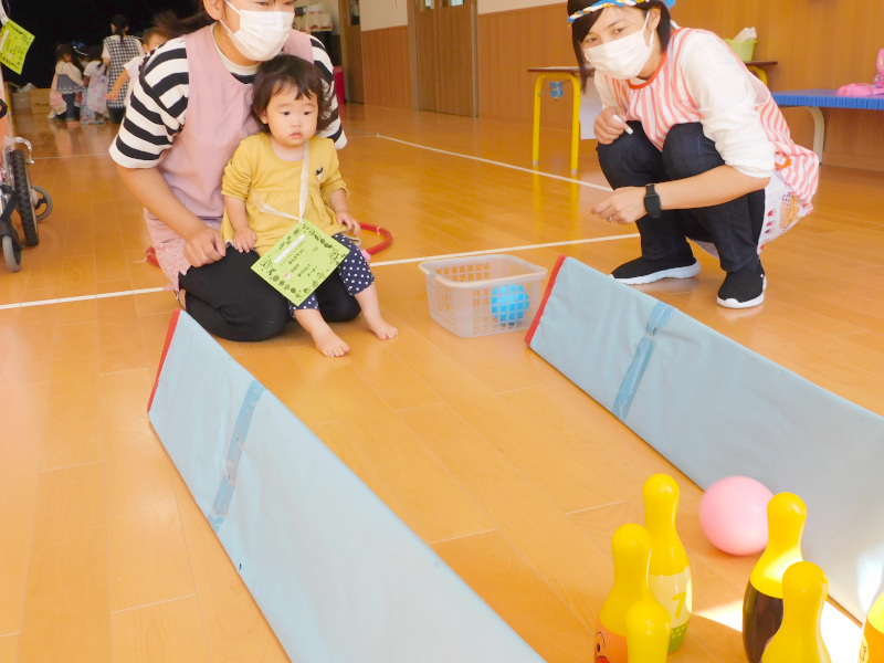ボウリングコーナーでは、おっかなびっくりボールを投げる未満児さんに対し、思いっきりボールを投げピンをたくさん倒す以上児さんの姿がありました。くじ引きコーナーでは、くじ引きの箱に手を入れることも怖くて先生と一緒に行う未満児さんでした。以上児さんになると景品を見渡して自分の欲しい景品に狙いを定めてくじを引きます。欲しいものが当たった時には大喜びでした。ハンカチ釣りコーナーでは、先生と一緒に棒やモールで引っ掛けてハンカチを釣り上げていた未満児さん。以上児さんは糸のついた釣竿をゆっくりじっくり動かして慎重にハンカチを釣り上げていました。