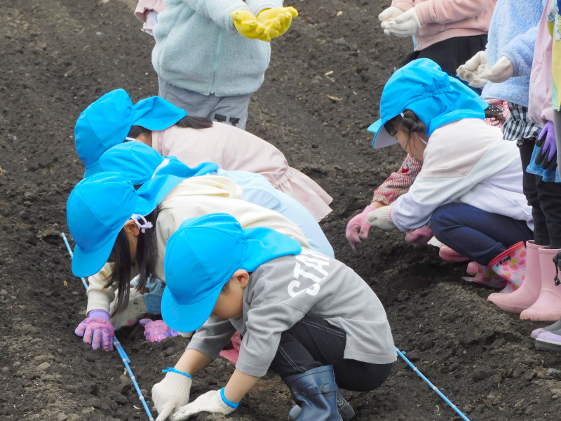 年中さんと年長さんでバスに乗って、ふれあい農園「すずらんど」までお出かけし、種まきを行いました。農園の職員さんに教えていただきながら「とうもろこし」「枝豆」「じゃがいも」の種をまきました。農園の職員さんから小さな赤い種を受け取り、落とさないようにしっかり握りしめ、そっと畑にまいていた子ども達です。