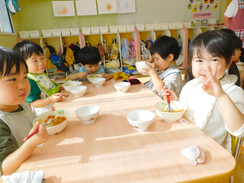 「今日は特別なカレーだよ」と先生に教えてもらうと、「おいしい!!」「おいしい!!」とおかわりをしていた子どもたちです。「いつものカレーもおいしいけど、またこのカレー食べたいな」という声も聞かれ、お気に入りの味となりました。