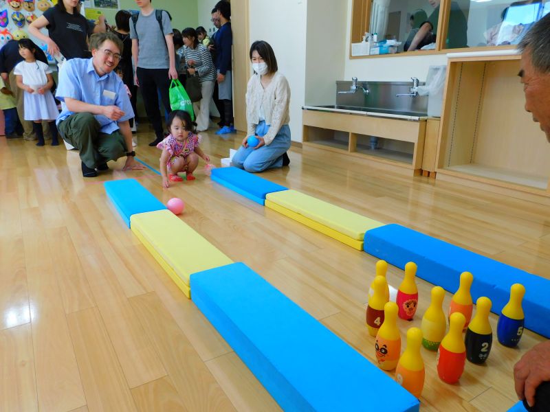 園舎内へ移動して催し物のブースを親子で楽しみました。いつもとは違うこども園のお祭りの雰囲気に笑顔いっぱい!お家の方やお友だちと飲み物を飲んだり、おにぎりを食べたり、あちこちでかわいい笑顔がたくさん見られました。