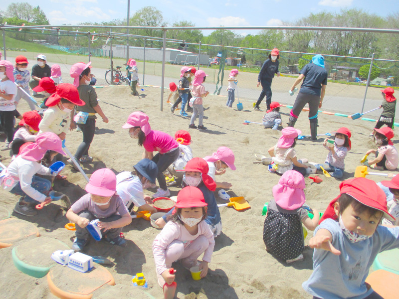 こんにちは!ひよこ組です♪少しずつひよこ組にも慣れてきました✿年長さんと一緒に園外めぐりもして、お外遊びのお約束も教えてもらいましたよ!初めての砂場遊びも、みんなでお約束を守りながら、楽しみました!大きなお山を作ってみたり、おもちゃと砂を使ってお料理をしているお友だちもいました☆これから、たくさんお外遊びも楽しんでいきたいと思います♪