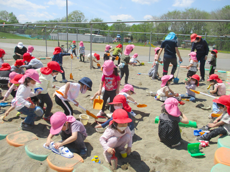 こんにちは!!新しい環境にも少しずつ慣れて、笑顔いっぱいの子どもたちです(^^)楽しみにしていた砂場遊びでは、みんなで最初にお約束を確認し、穴掘りやお山を作ったりして、砂の感触を楽しみながら遊びましたよ。お天気の良い日は、外遊びをたくさん取り入れていきたいと思っています♪♪