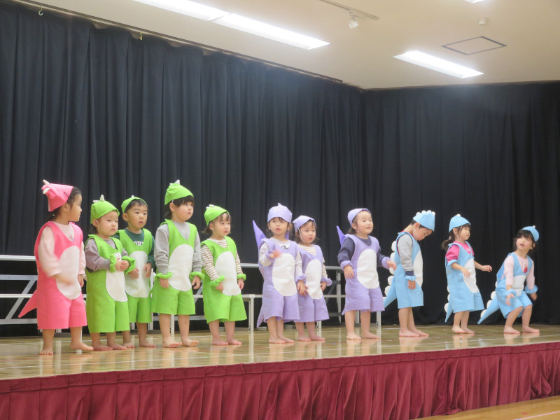 こんにちは!みかん組です☆今月は、ドキドキの発表会がありました!大きなステージにドキドキでいっぱいでしたが、みかんさんみんなで恐竜さんに変身して楽しみましたよ☆お歌も頑張りました!!お家の人が観に来てくれたことがとっても嬉しいかったみかんさんです♪