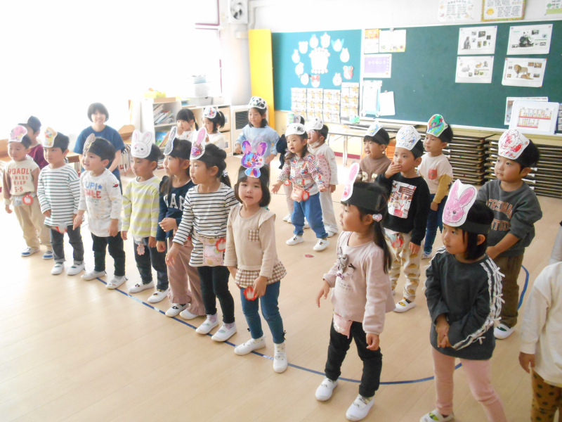 発表会練習が始まりました。ひよこ組のテーマはジャングル♪ 動物について興味を持ち、なりきり遊びを楽しんでいるところです。 そして、挑戦あそびのコマまわしも頑張っています!「できた!」と喜ぶ笑顔がだんだん増えてきました☆コマ回し名人表があり出来たらシールを貼ることが出来るので「貼りたい!」と頑張っていますよ♪