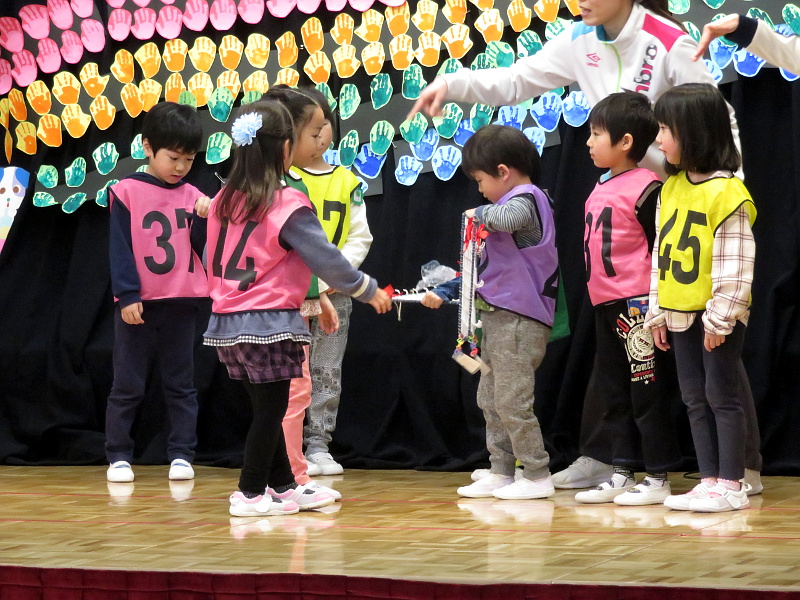 当日は、まず満三歳児さん・年少さん・年中さんがホールに集まり、みんなで年長さんを拍手でお迎え、今までお世話になった年長さんへ歌のプレゼントとお礼の言葉を贈りました。その後、たて割りチーム班毎に分かれて班対抗のゲームをし、とても盛り上がっていました(#^^#)