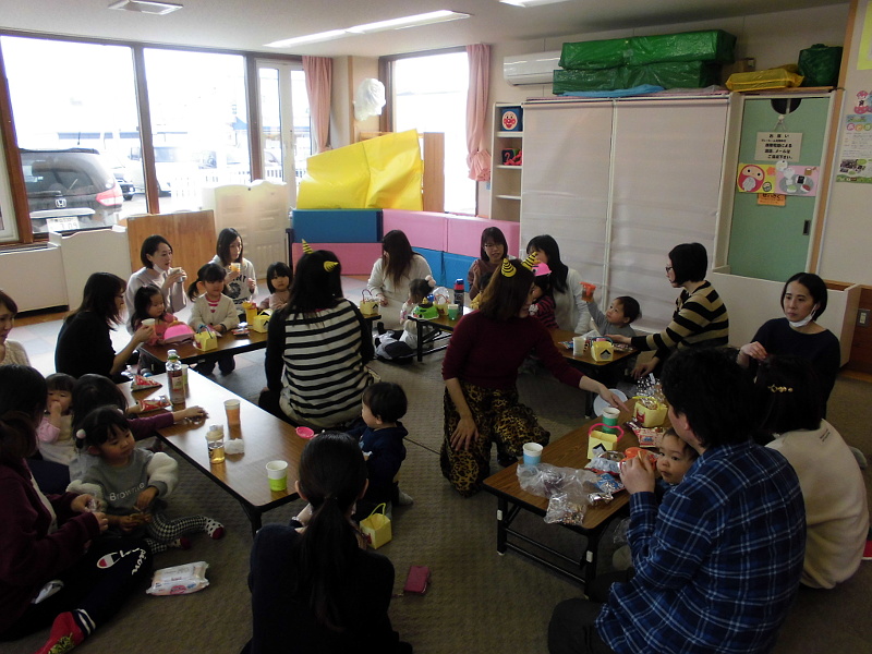 豆まきでは上手に鬼に向かって豆に見立てた紙玉をぶつけて楽しんでくれました。その後はみんなでゆっくりとお菓子を食べながらお茶会。ママたちの会話も弾んでいましたよ♪