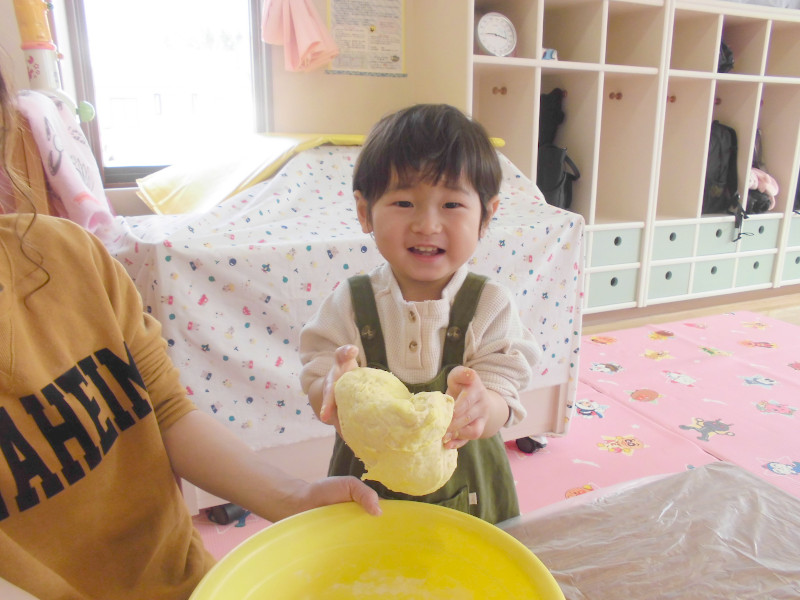 最初は小麦粉のサラサラした感触を確かめ、お母さんと一緒に水と油を入れて混ぜました。ベタベタの感触を嫌がる子が多く、ほとんどはお母さんがこねていましたよ(*^-^*)