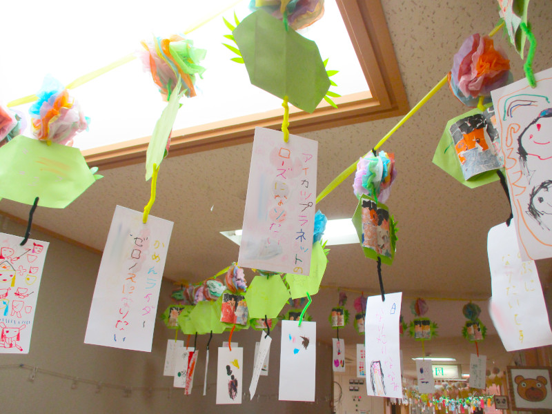 今日は楽しみにしていた七夕まつり。暑さのため全体で集まって七夕まつりを行うことは出来ませんでしたが、各クラス、カラフルな短冊を作って廊下に飾ったり、お部屋でアイスを食べて楽しみました。 おやつの七夕ゼリーも可愛くておいしくて、みんなとっても喜びました。