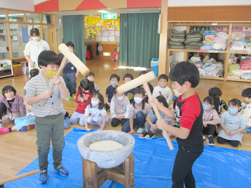 12/20(火)に「もちつき」を行いました。お遊戯場でくま組さん・ぞう組さん・ぱんだ組さんが順番にもちつきしました。うさぎ組さんとひよこ組さんはもちつきをするおにいさんおねえさんたちに「がんばれがんばれ〜」と元気いっぱいに応援しましたよ!