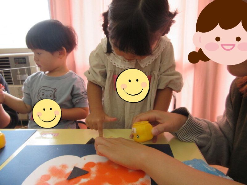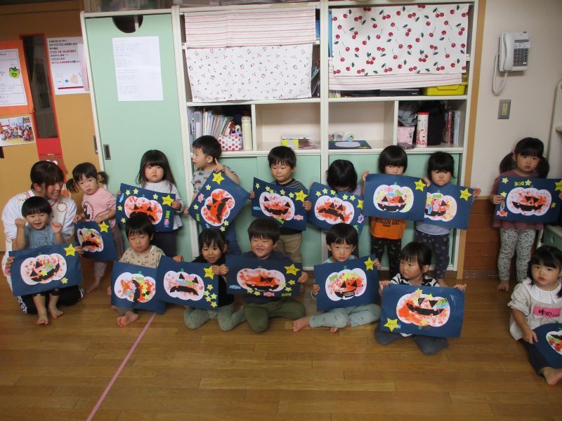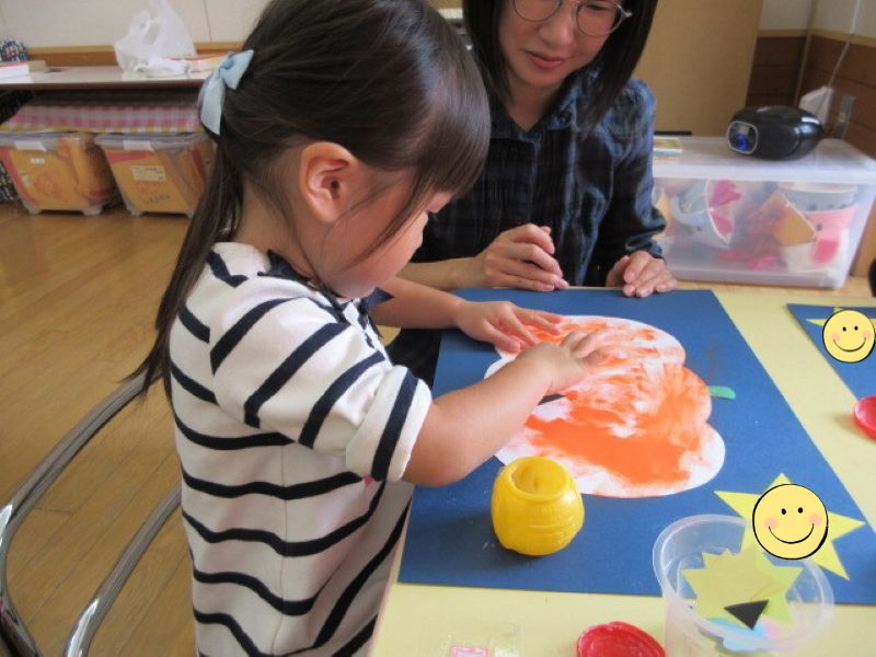 今回は、こども園のうさぎ組(2歳児クラス)にお邪魔してきましたよ。まずは制作・・・スタンプでかぼちゃに色付けしたり、飾りをのりで好きなように貼り、とってもかわいいハロウィン制作になりました!